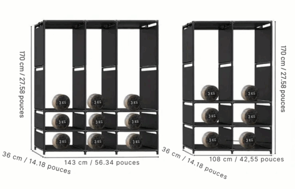 👗 Grande Capacité – Trois zones de suspension pour vêtements et accessoires.